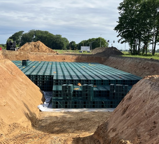 Im neuen Gewerbegebiet „Östlich der Bundestraße B 70“ anfallendes Niederschlagswasser soll künftig vollständig im Gewerbegebiet versickern. Dafür hat die Stadtentwässerung im Zuge der Erschließung des Gewerbegebietes zwei große Versickerungsanlagen errichtet. Hier erfolgt nach der Fertigstellung des Gewerbegebietes die Versickerung in unterirdischen Versickerungsmodulen aus Kunststoffrigolen, die in der Lage sind, über 2.000 Kubikmeter Regenwasser aufzunehmen und zwischen zu speichern. Zur Erhöhung des Speichervolumens wurden zusätzlich über den Rigolen Versickerungsmulden angeordnet. Damit kann von beiden Versickerungsanlagen ein 100jährliches Regenereignis aufgenommen und versickert werden. Die Bauzeit für die Anlagen betrug circa sechs Wochen – dabei wurden über 5.200 Versickerungsmodule verbaut.